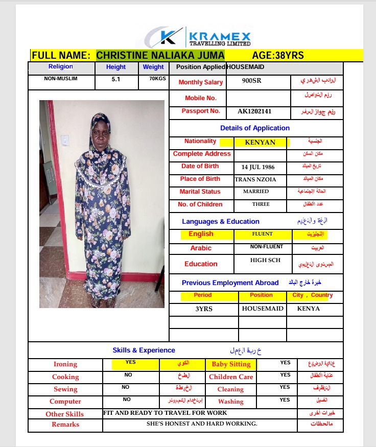 خبرات ومهارات العاملة المنزلية Ak1202141 – CHRISTINE NALIAKA JUMA