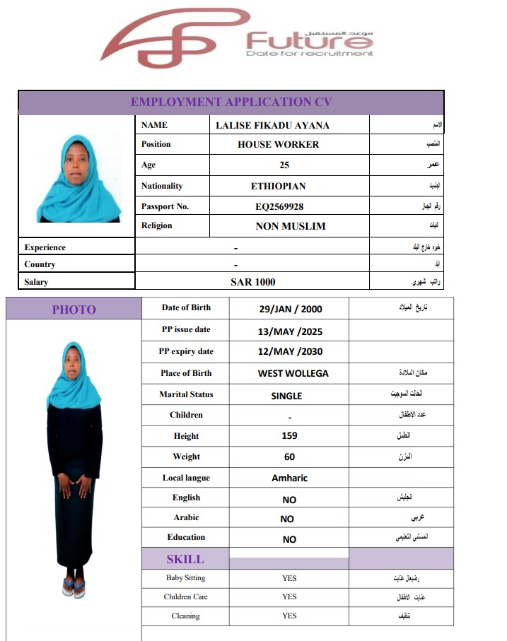 يُقدم لك مكتب موعد المستقبل بجدة خدمات استقدام عمالة منزلية من إثيوبيا يلتزم بجميع الإجراءات القانونية وفق لوائح مساند. ويُمكنك الحين اختيار المرشح المناسب لك من بين أفضل العمالة المنزلية عبر مكتب الاستقدام موعد المستقبل أفضل مكتب استقدام عمالة في جدة، مع ضمان المتابعة الكاملة وتقديم خدمة ما بعد الوصول لضمان رضاك واستقرار العامل.