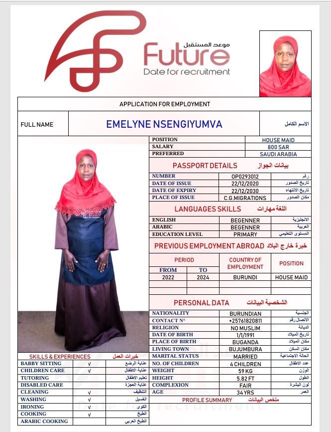 خبرات ومهارات عاملة منزلية مقيمة من بوروندي