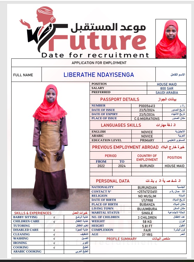 يُقدم لك مكتب موعد المستقبل بجدة خدمات استقدام عمالة منزلية من بوروندي يلتزم بجميع الإجراءات القانونية وفق لوائح مساند. ويُمكنك الحين اختيار المرشح المناسب لك من بين أفضل العمالة المنزلية عبر مكتب الاستقدام موعد المستقبل، مع ضمان المتابعة الكاملة وتقديم خدمة ما بعد الوصول لضمان رضاك واستقرار العامل.